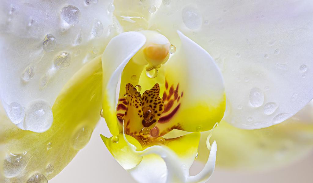 Wallpaper White orchid flower in water drops close up