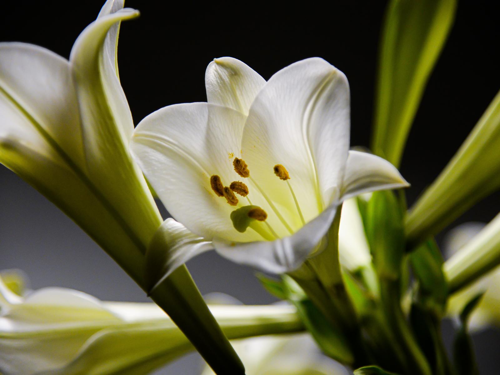 Wallpaper White beautiful lilies with buds on a black background