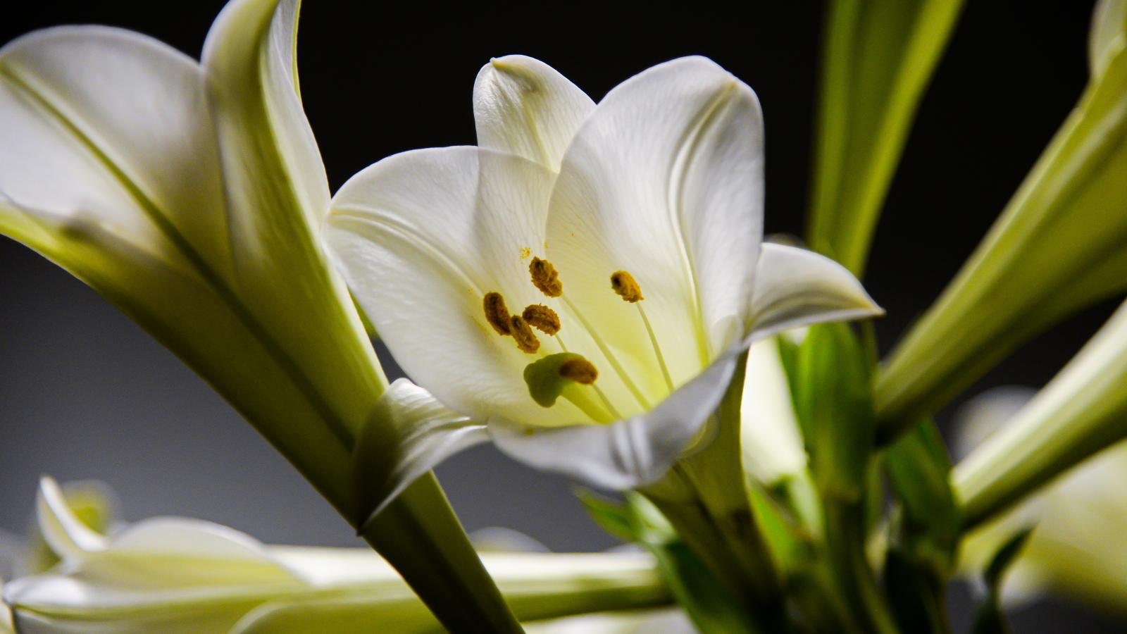 Wallpaper White beautiful lilies with buds on a black background