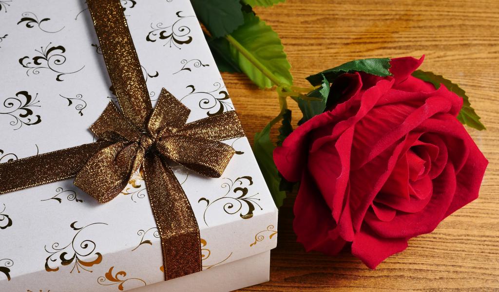 Wallpaper Red rose flower on the table with a gift