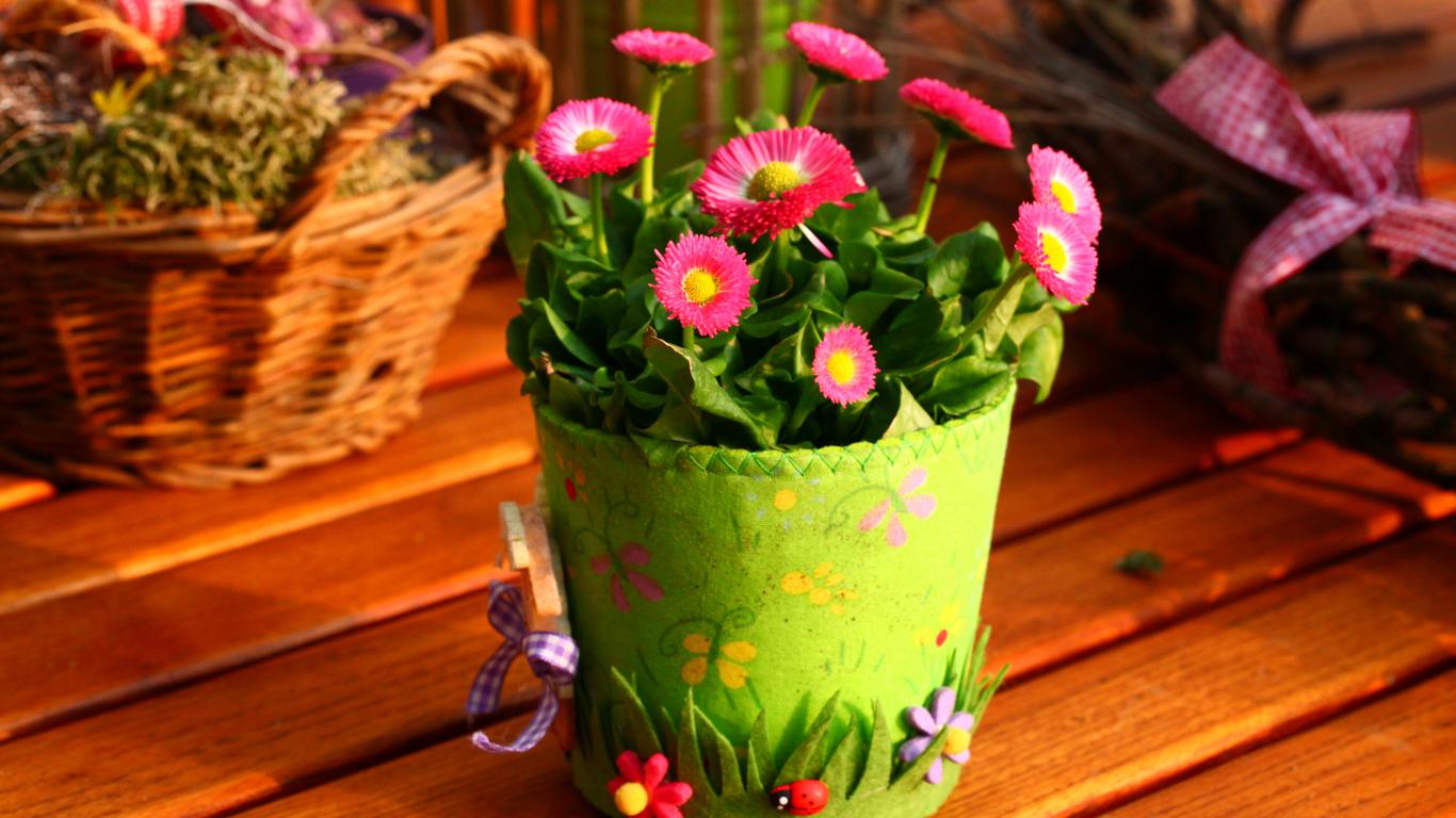 Wallpaper Pink daisies on the table in a green pot