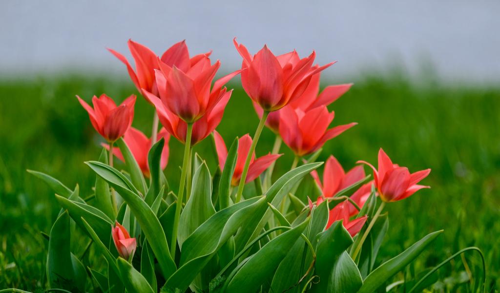 Wallpaper Pink tulip flowers on a field in green grass
