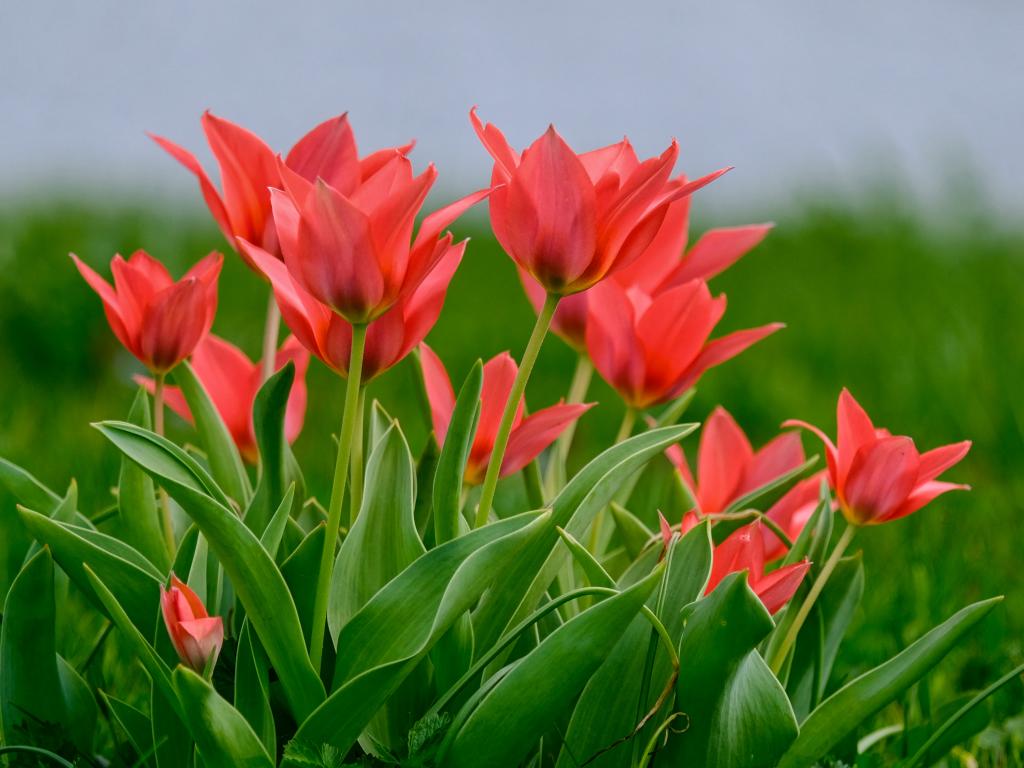 Wallpaper Pink tulip flowers on a field in green grass
