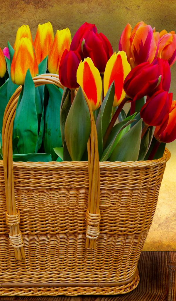 Wallpaper Beautiful bouquet of tulips in a basket on a wall background