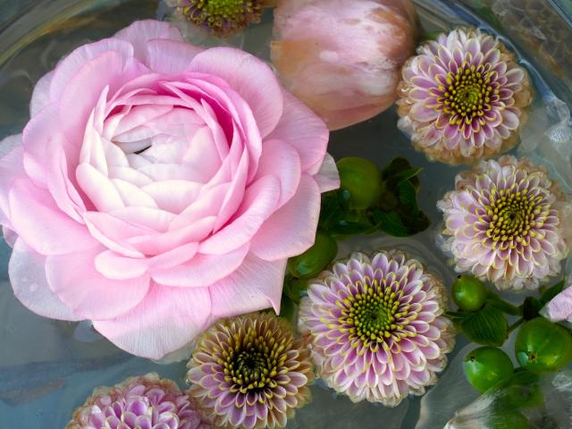 Wallpaper Pink rose with chrysanthemums in water