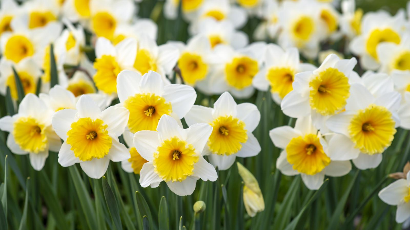 Wallpaper Delicate white daffodils with buds on a flower bed