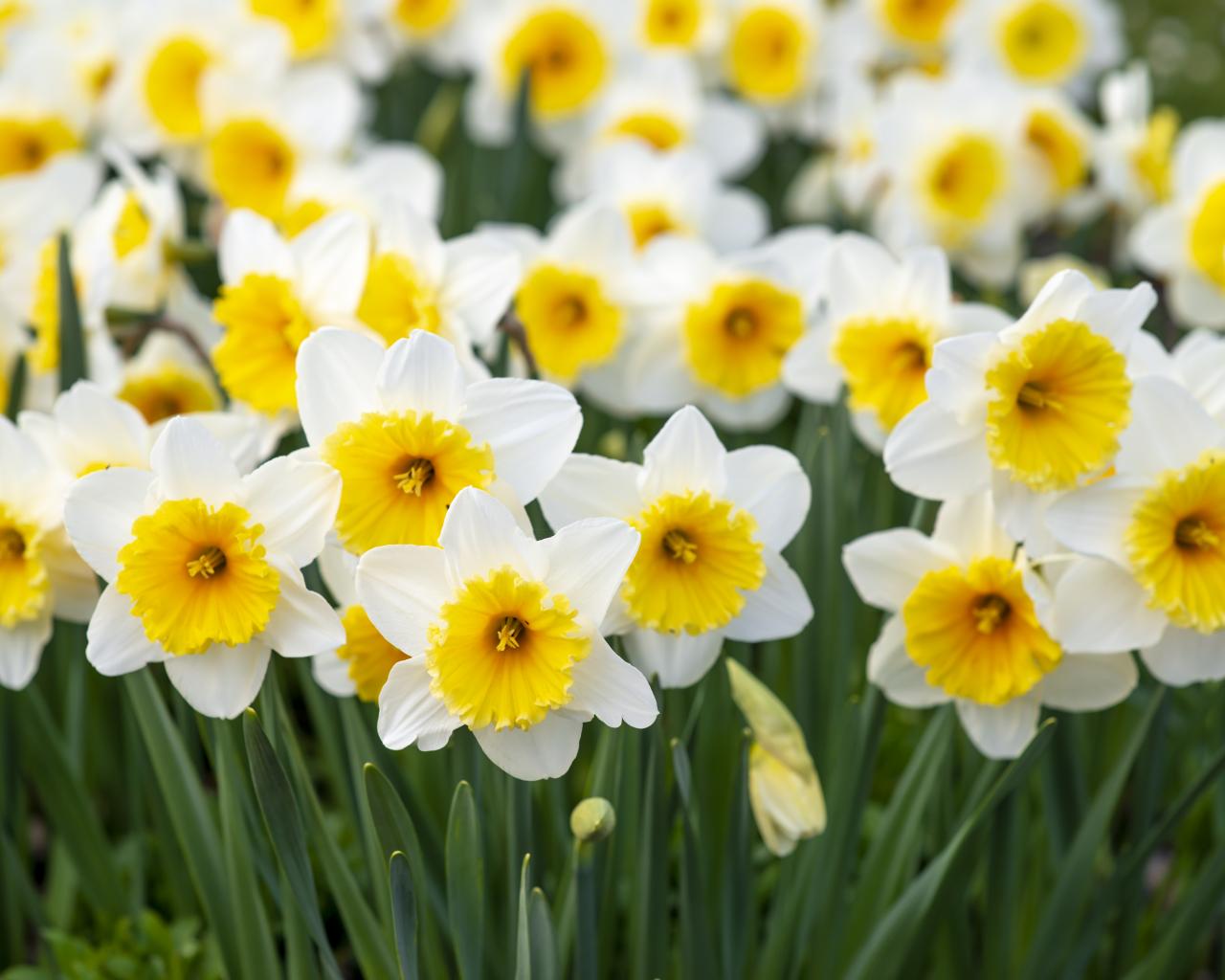 Wallpaper Delicate white daffodils with buds on a flower bed