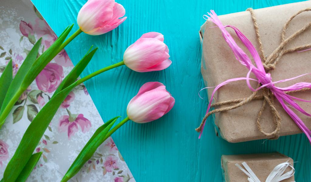 Wallpaper Three pink tulips on a blue table with gifts