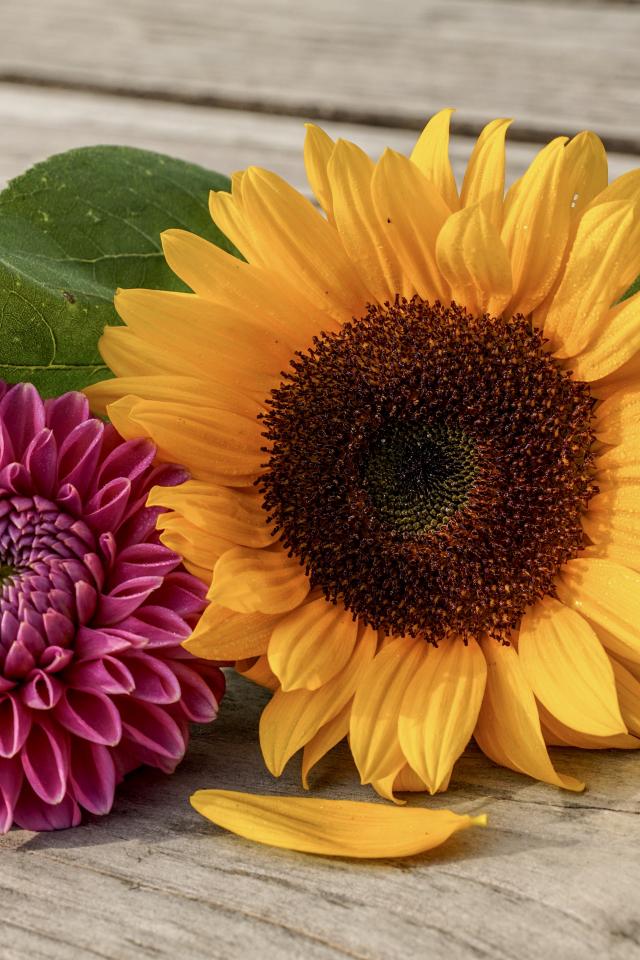 Wallpaper Sunflower and dahlia flower on a wooden bench