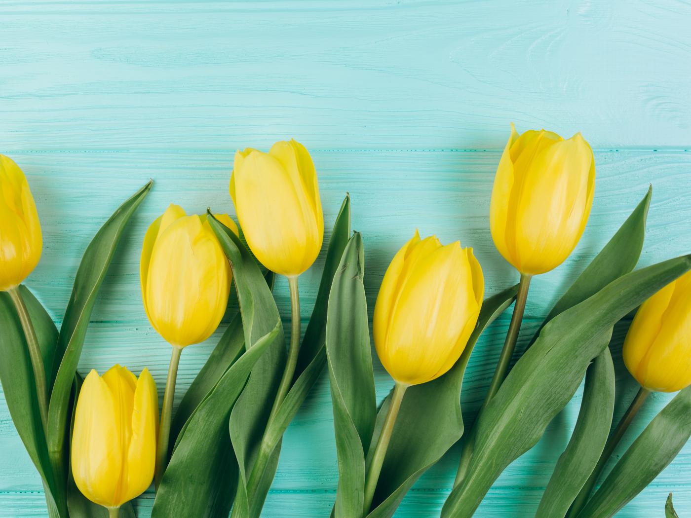 Wallpaper Beautiful yellow tulips with green leaves on a blue table