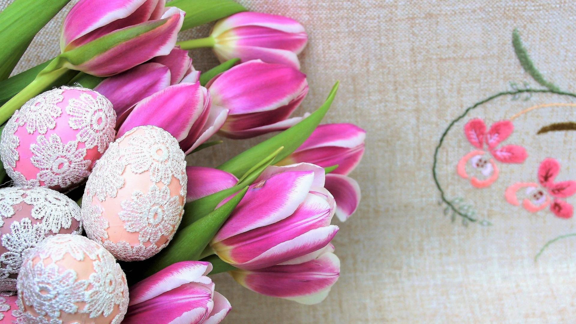 Wallpaper Lacy Easter eggs with tulips