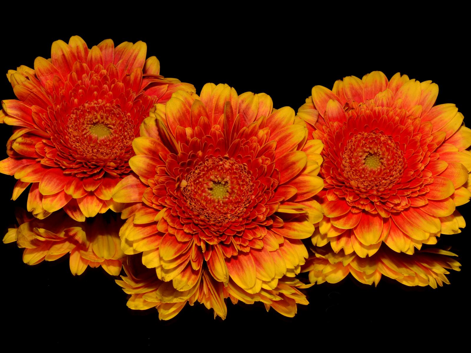 Wallpaper Three orange chrysanthemum flowers on a black background
