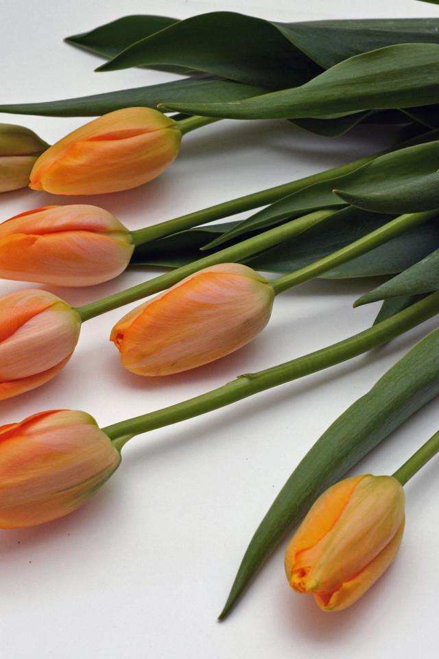 Wallpaper Orange flowers tulips with green leaves on a white background