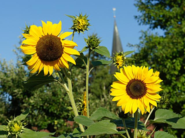 Wallpaper Two blossoming flowers of a sunflower with buds