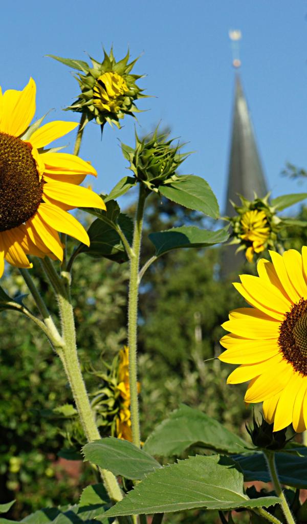 Wallpaper Two blossoming flowers of a sunflower with buds