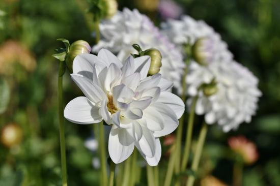 Wallpaper White dahlias with buds in the sun on a flower bed