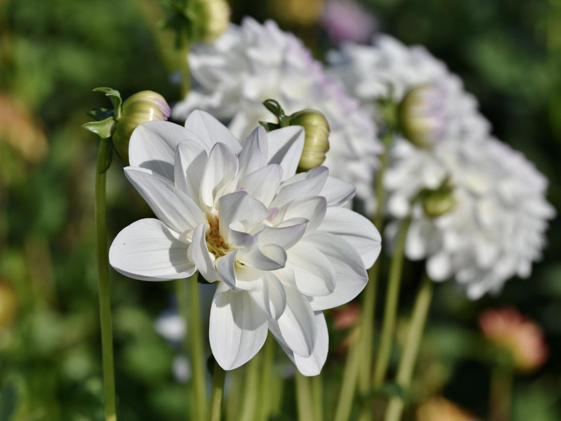 Wallpaper White dahlias with buds in the sun on a flower bed