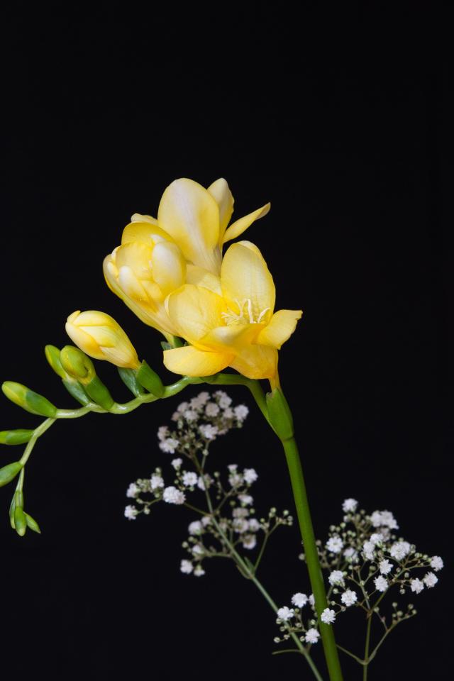 Wallpaper Delicate yellow freesia flower on a black background