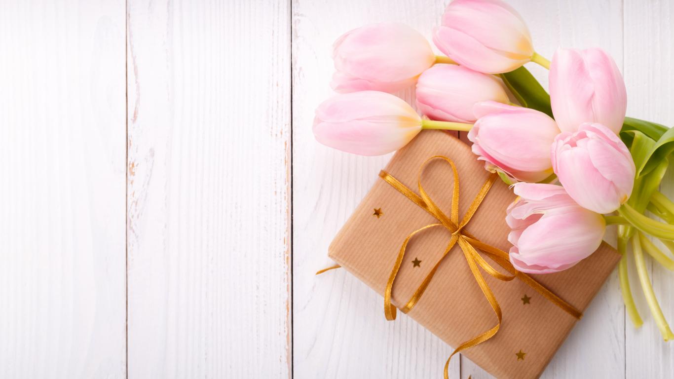 Wallpaper Bouquet of delicate tulips with a gift on a wooden table