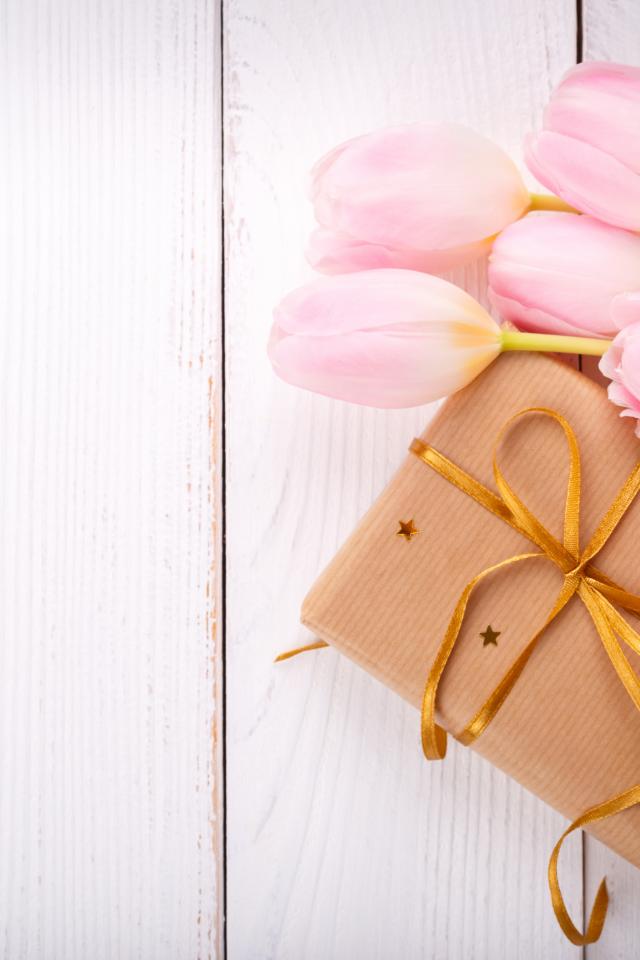 Wallpaper Bouquet of delicate tulips with a gift on a wooden table