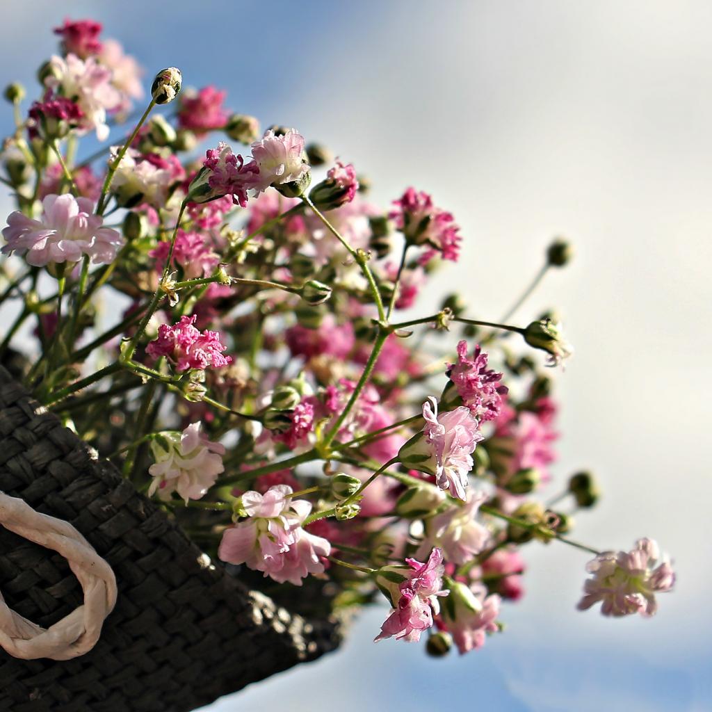Wallpaper Bouquet of pink flowers in a basket against the blue sky