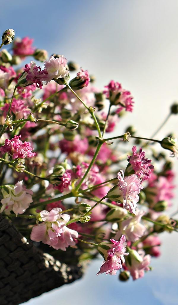 Wallpaper Bouquet of pink flowers in a basket against the blue sky