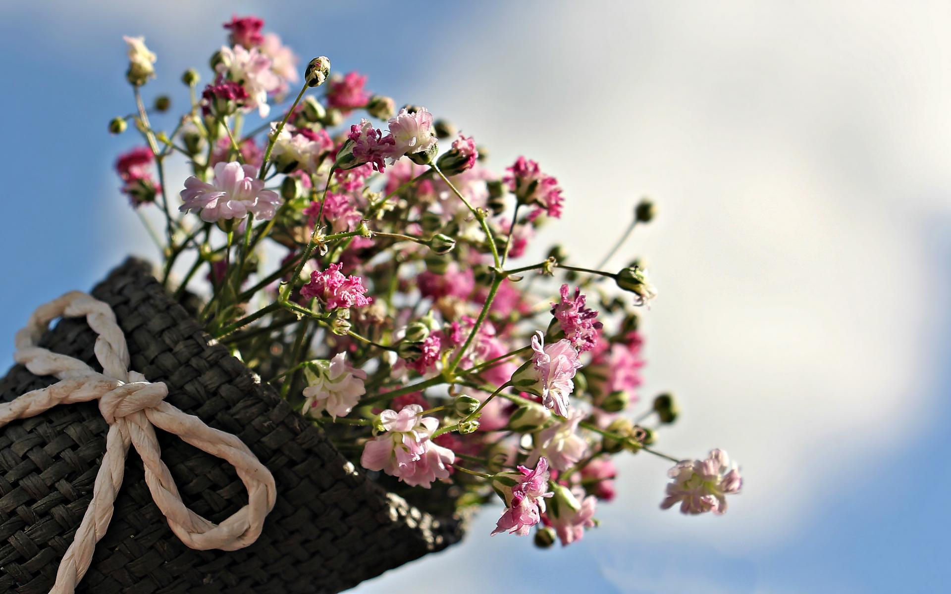 Wallpaper Bouquet of pink flowers in a basket against the blue sky