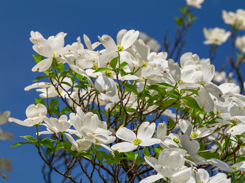 Wallpaper Beautiful white flowers on a bush under the blue sky
