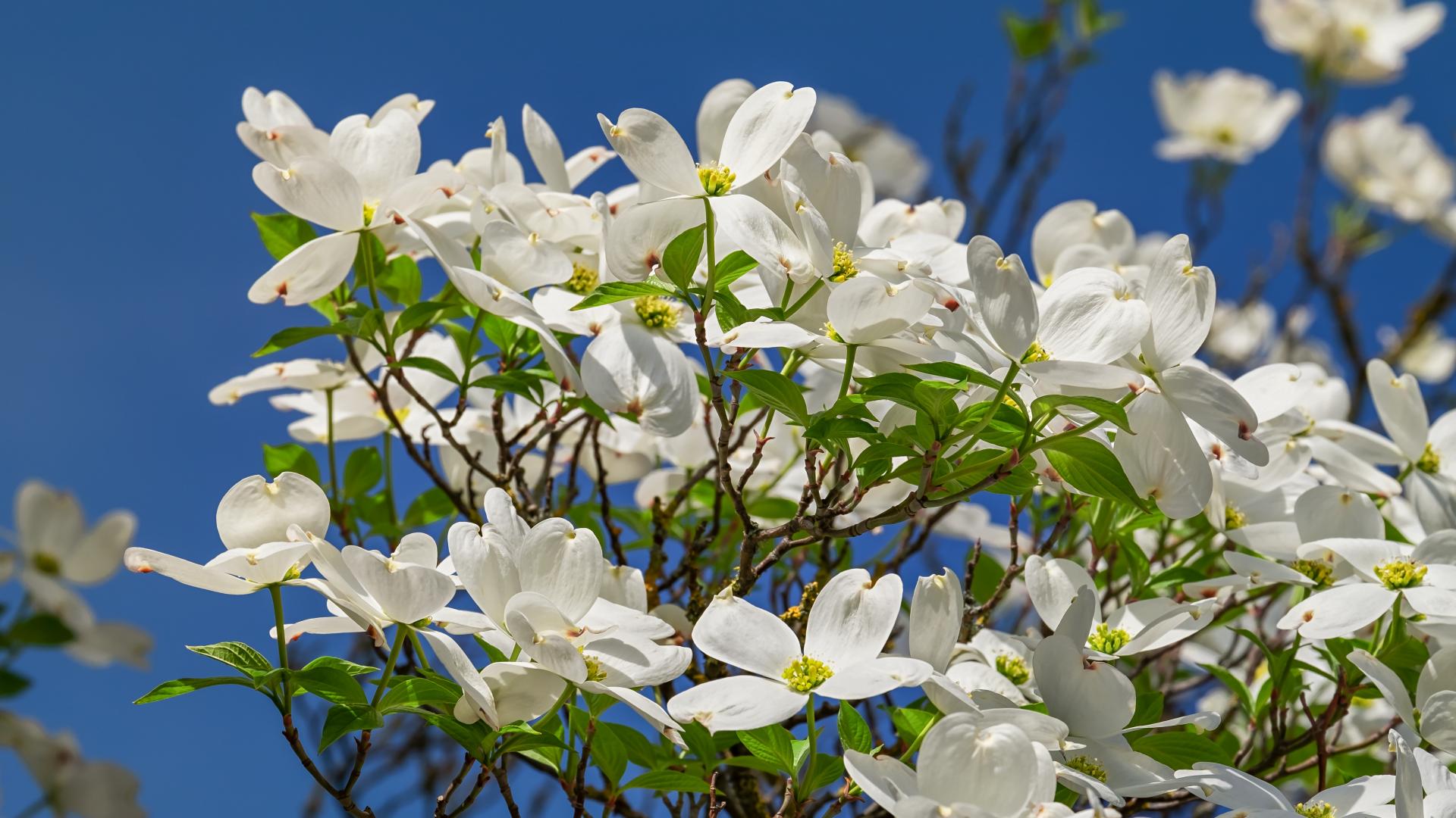 Wallpaper Beautiful white flowers on a bush under the blue sky