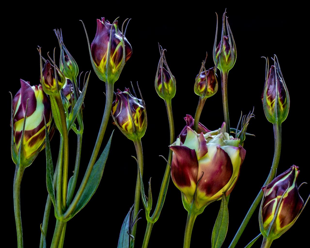 Wallpaper Eustoma flowers bloom on a black background
