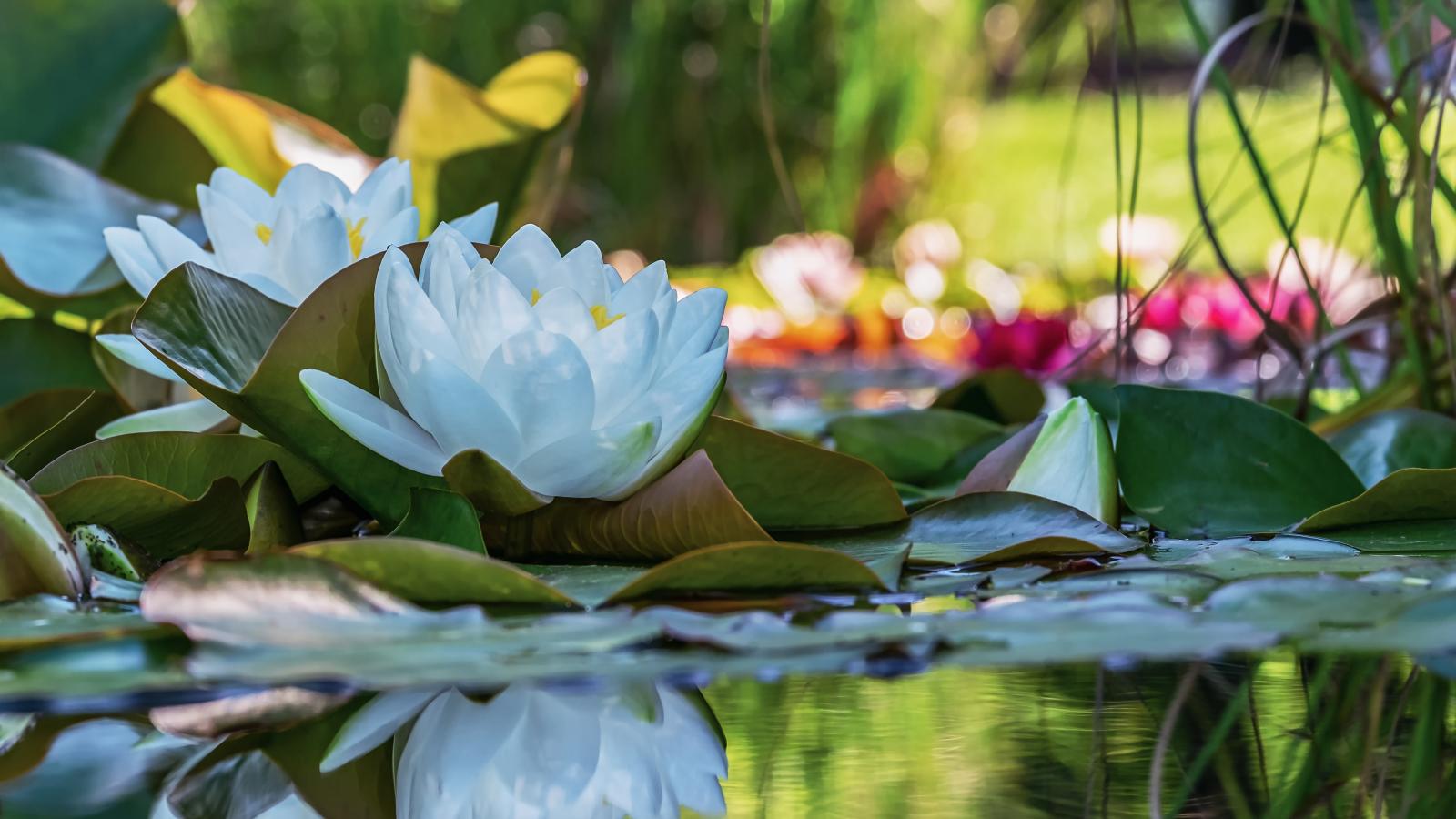 Wallpaper White water lily flowers are reflected in the water