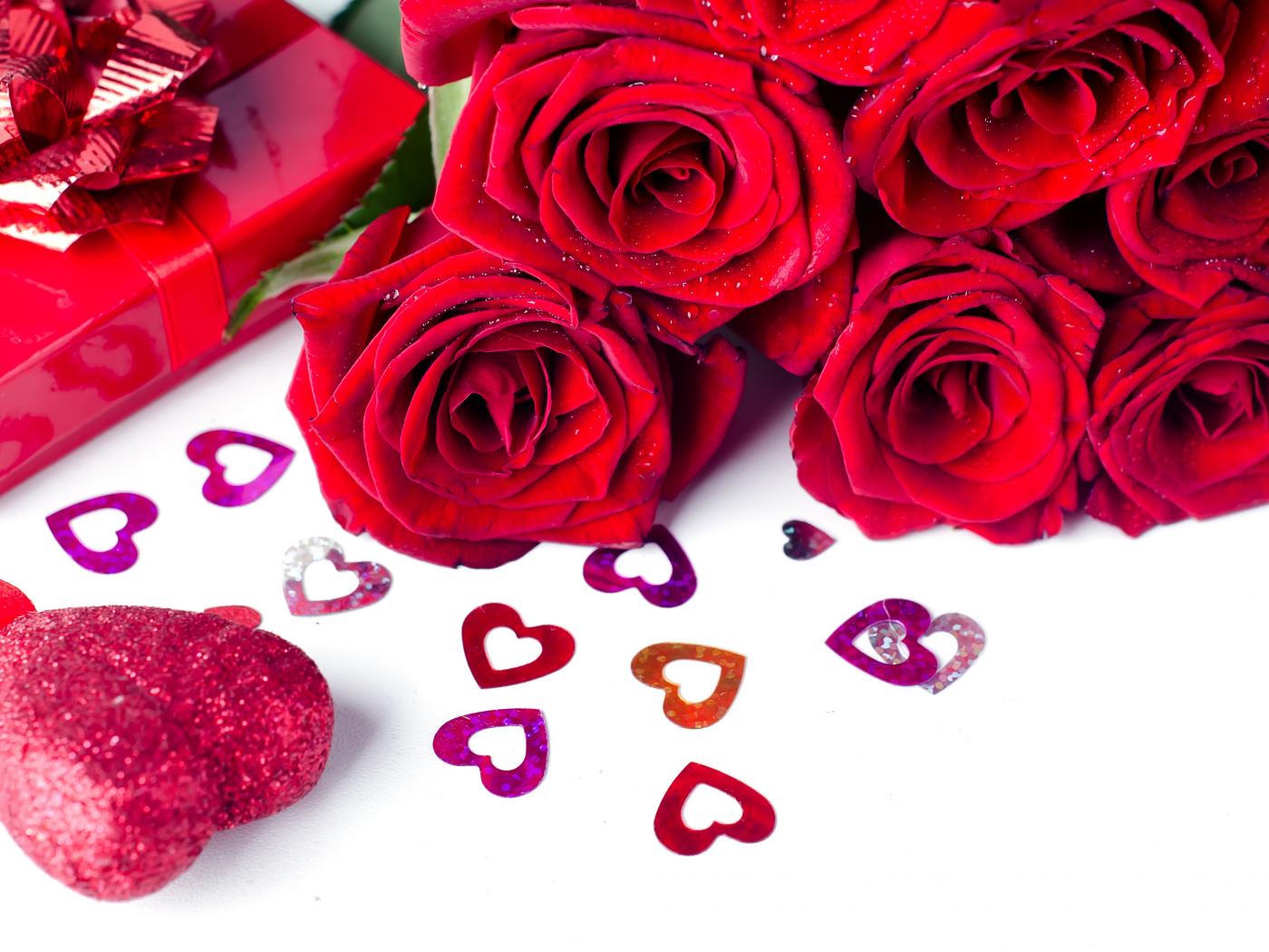 Wallpaper Bouquet of red roses with hearts on a white background