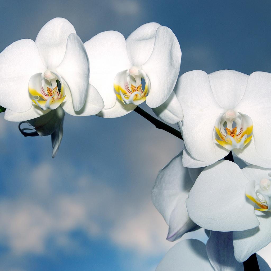 Wallpaper Branch of white orchid flowers with buds against the sky