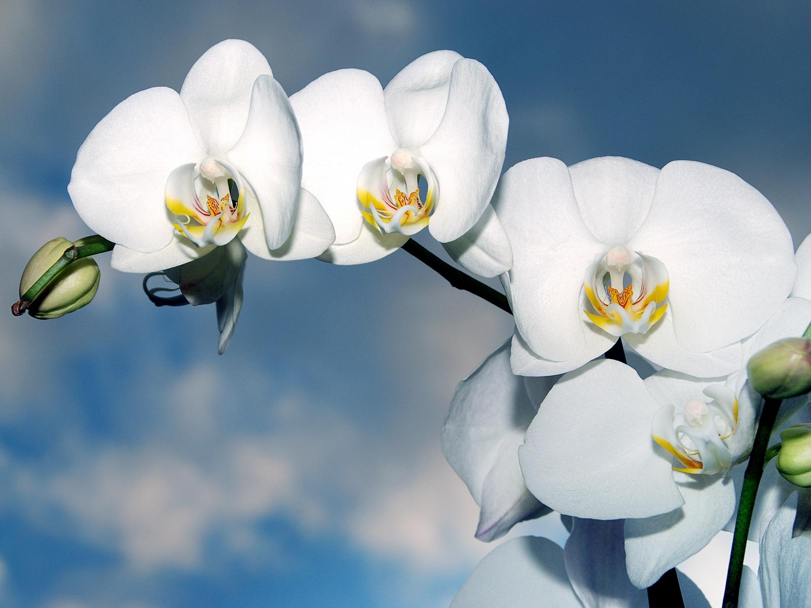 Wallpaper Branch of white orchid flowers with buds against the sky