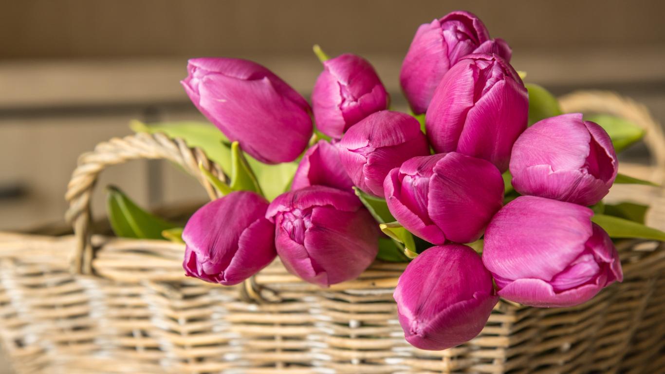 Wallpaper Bouquet of beautiful pink tulips in a basket on the table