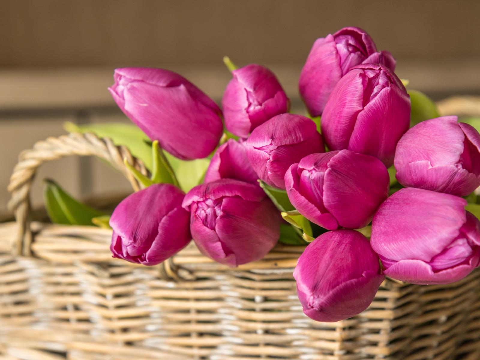 Wallpaper Bouquet of beautiful pink tulips in a basket on the table