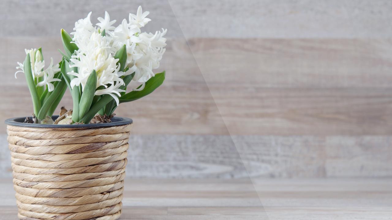 Wallpaper White hyacinth flowers in a pot on a wall background