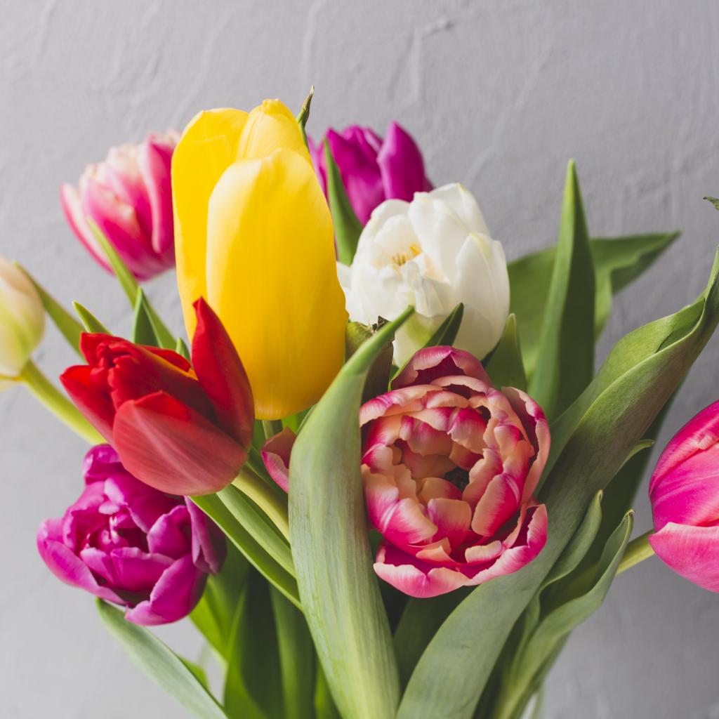 Wallpaper Bouquet of colorful tulips on a background of a gray wall