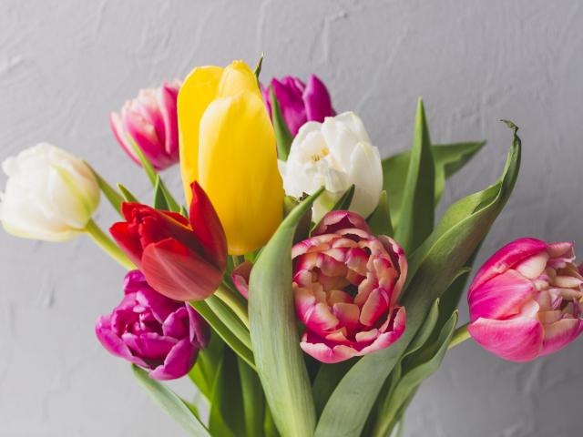 Wallpaper Bouquet of colorful tulips on a background of a gray wall