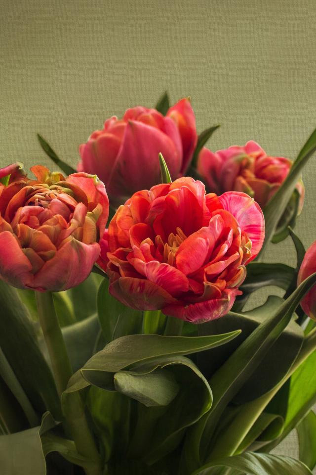Wallpaper Bouquet of red tulips with green leaves