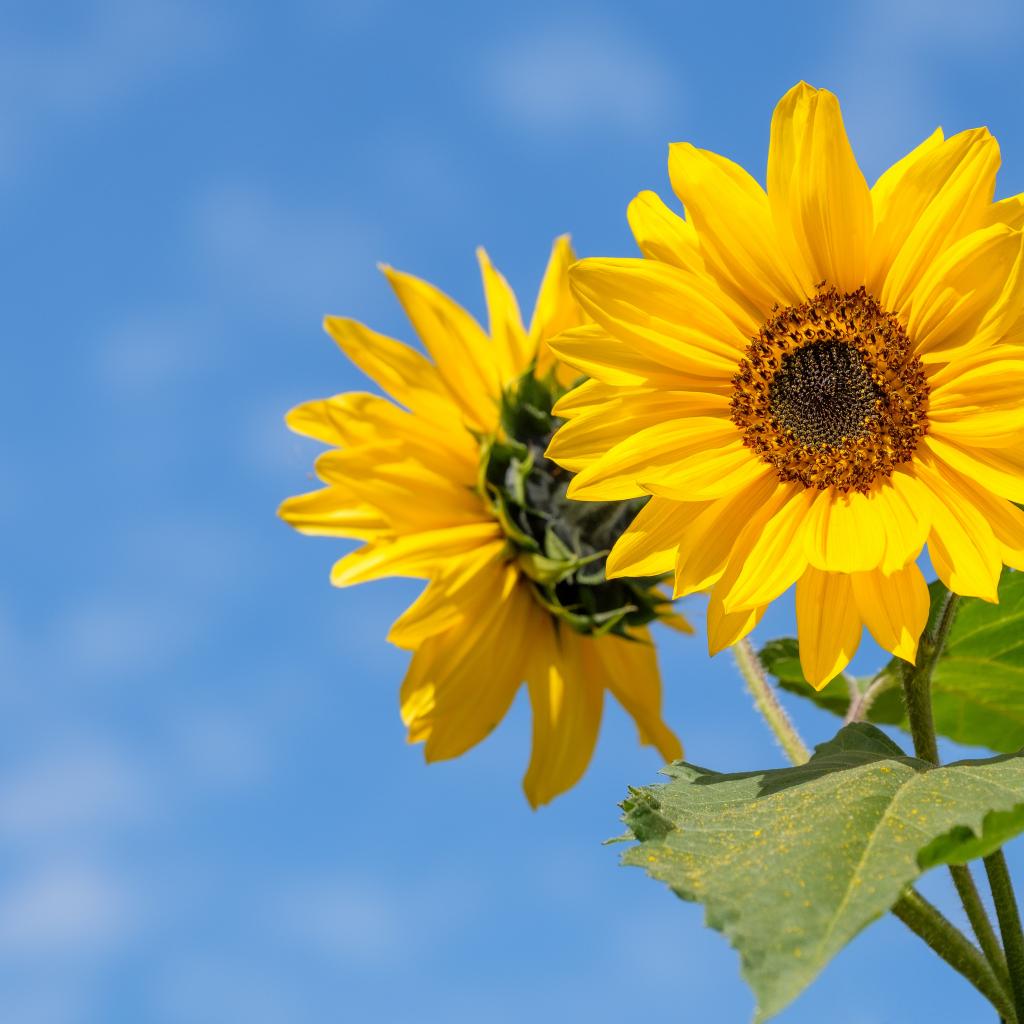 Wallpaper Two yellow sunflower flowers on a blue sky background
