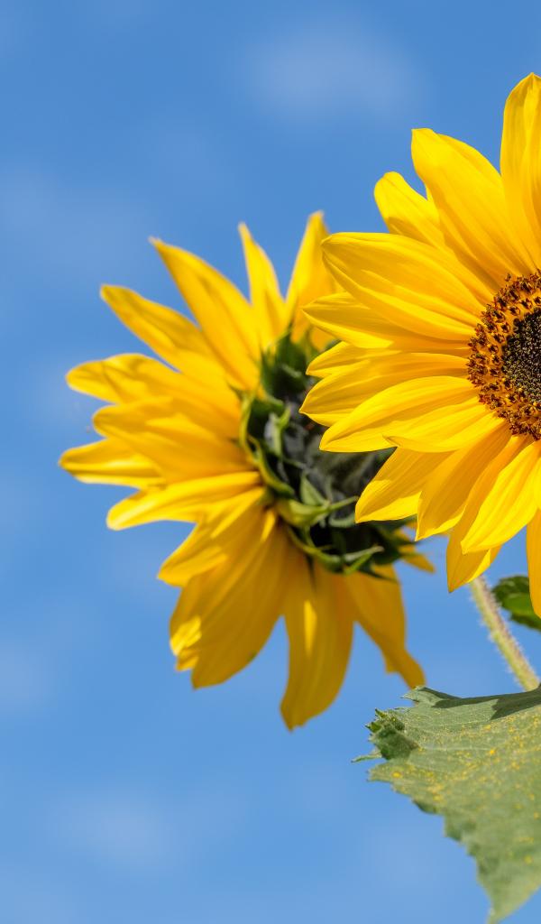 Wallpaper Two yellow sunflower flowers on a blue sky background