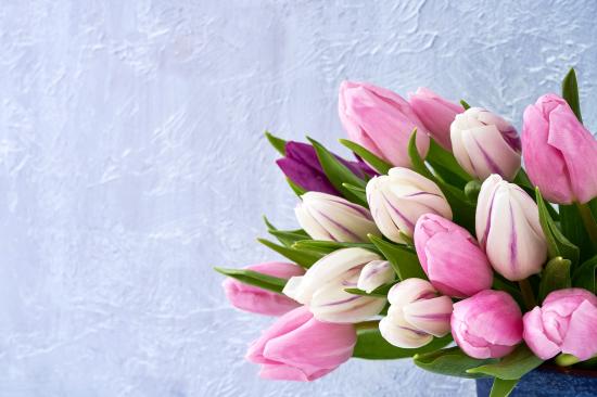 Wallpaper Bouquet of pink tulips on a gray wall background