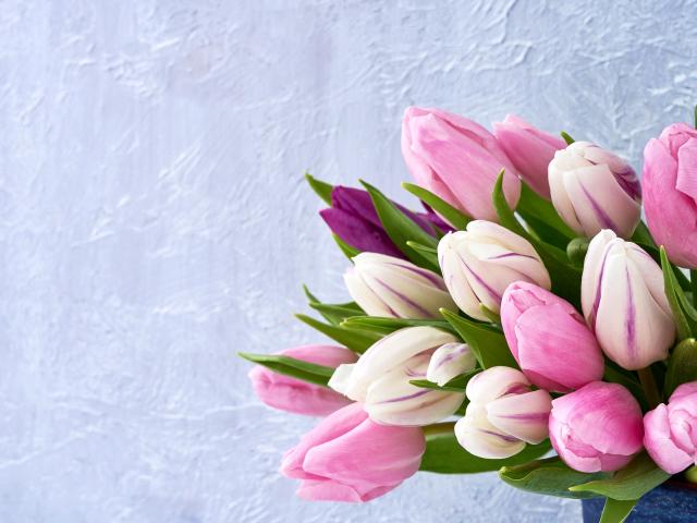 Wallpaper Bouquet of pink tulips on a gray wall background