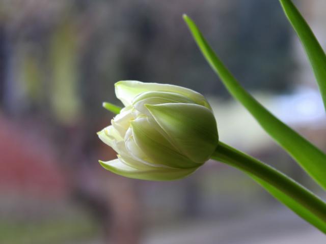Wallpaper White delicate tulip with green leaves close up