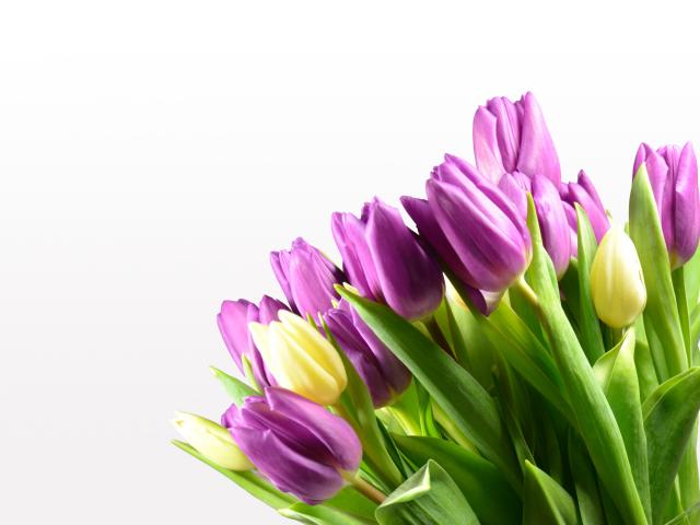 Wallpaper Lilac and yellow tulips in vases on a white background