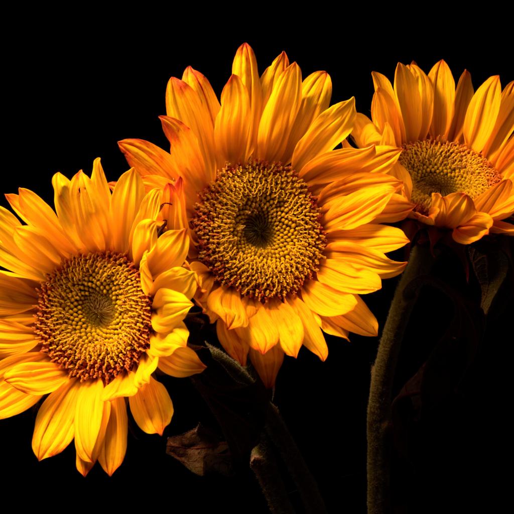 » Wallpaper Three sunflower flowers on a black background