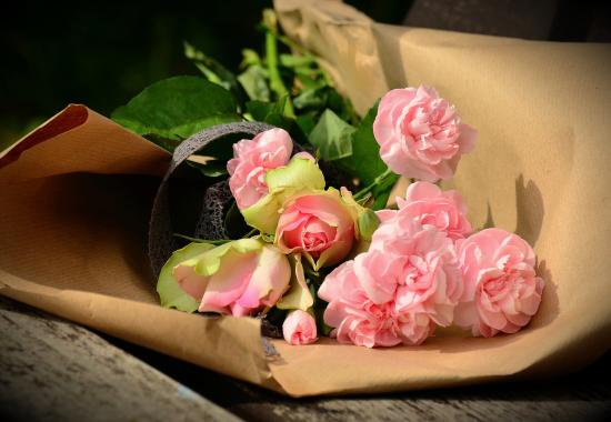 Wallpaper Bouquet of pink roses in paper packaging on the table