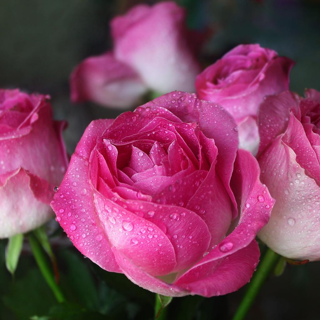 Wallpaper Beautiful pink rose in drops of dew on a flower bed