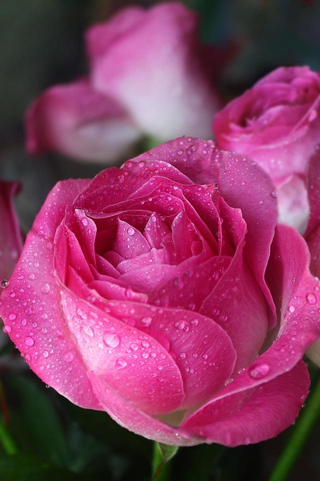 Wallpaper Beautiful pink rose in drops of dew on a flower bed